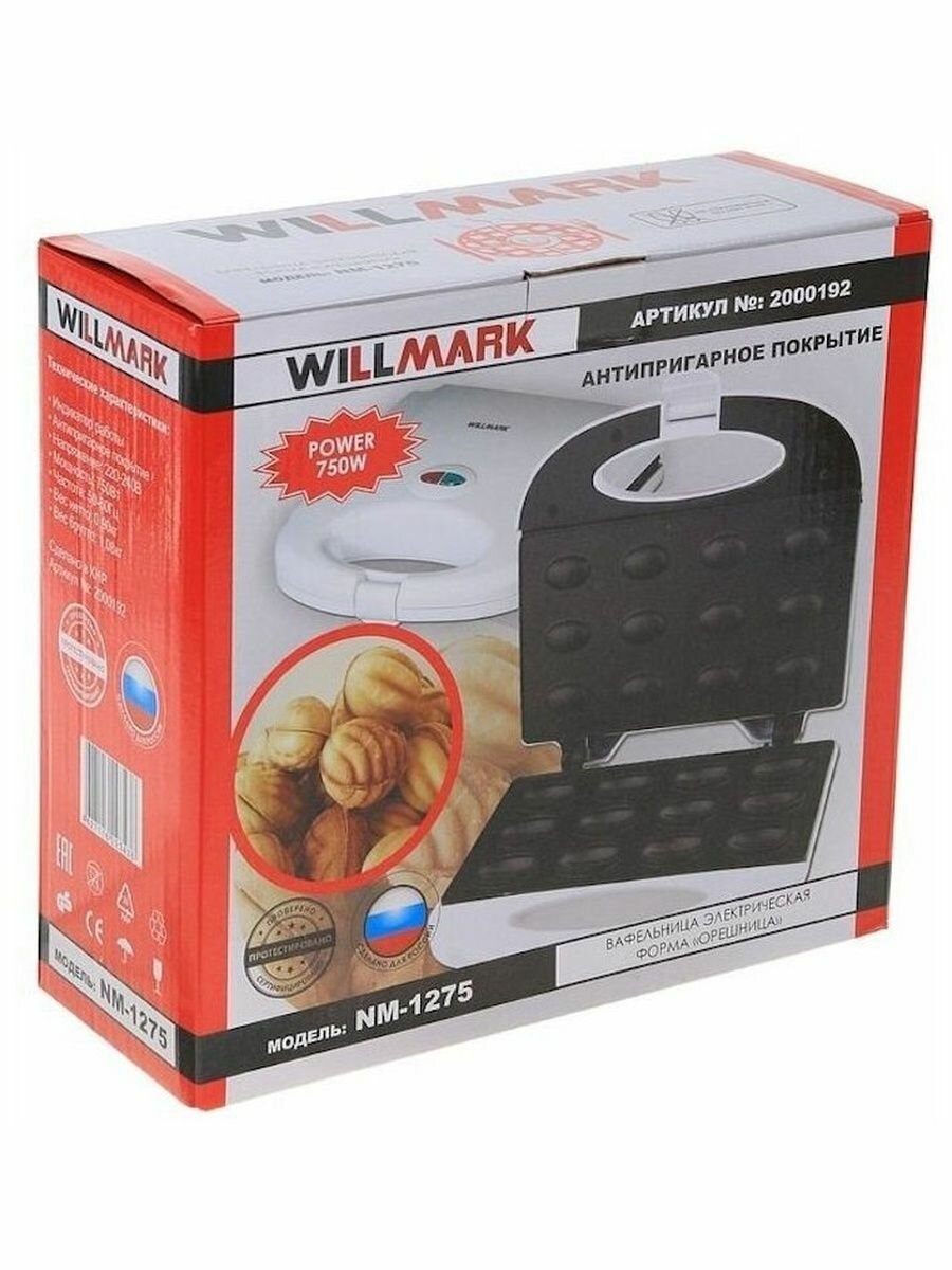 Вафельница WILLMARK NM-1275 (12 овальных полуформ "орех", мощность 750Вт,белая)