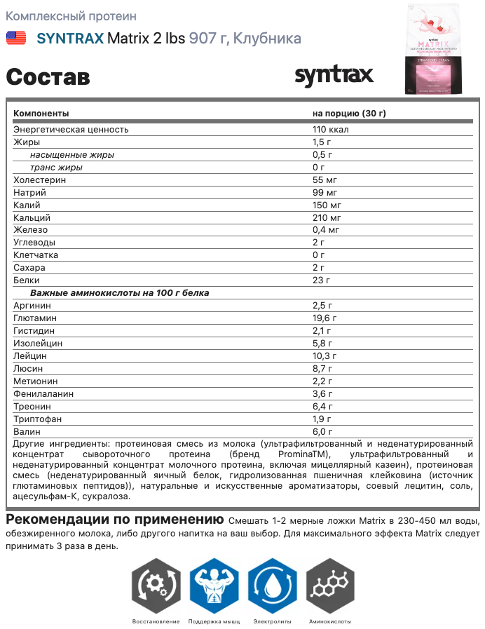 Ниже Вы можете прочитать отзывы на Многокомпонентный протеин Syntrax Matrix 907 гр Клубничный Крем, ознакомится с подробными характеристиками, посмотреть интересные обзоры и фотографии на Многокомпонентный протеин Syntrax Matrix 907 гр Клубничный Крем.