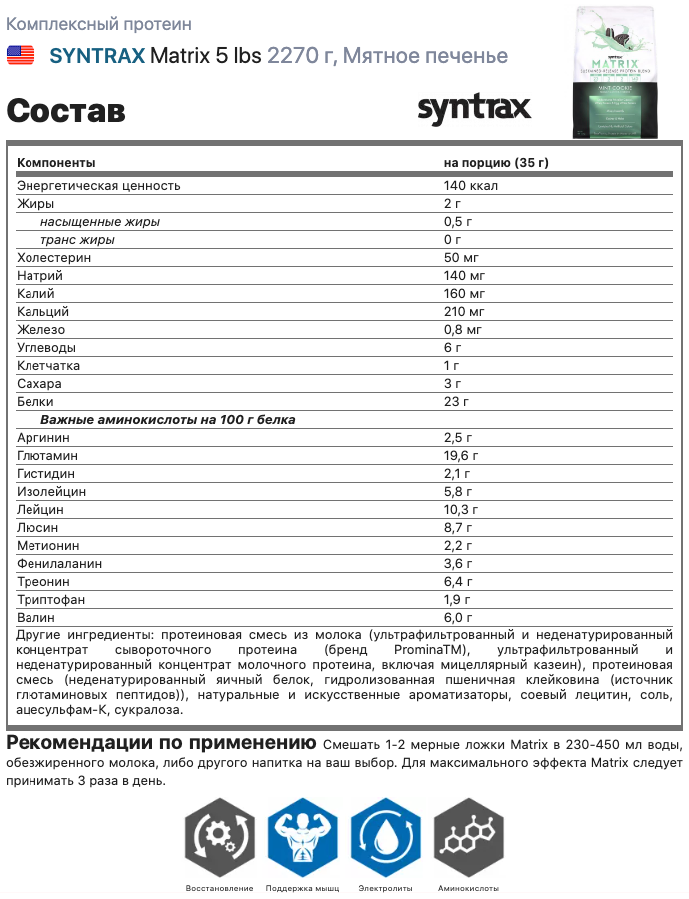 Ниже Вы можете прочитать отзывы на Многокомпонентный протеин Syntrax Matrix 2270 гр Мятное печенье, ознакомится с подробными характеристиками, посмотреть интересные обзоры и фотографии на Многокомпонентный протеин Syntrax Matrix 2270 гр Мятное печенье.