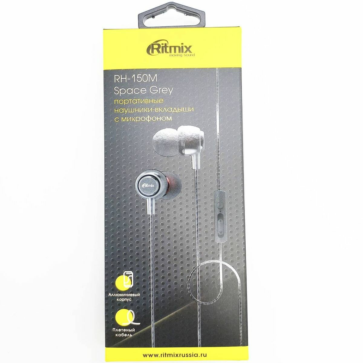 Наушники вкладыши с микрофоном Ritmix RH-150M Space grey, мобильная гарнитура, серая