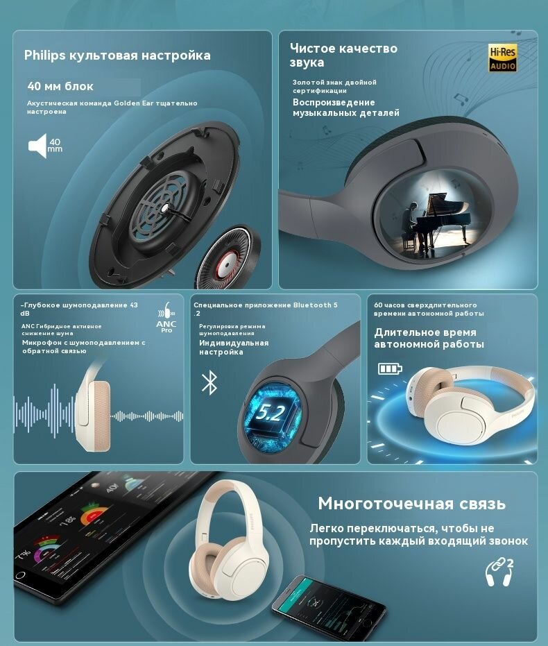 Bluetooth-гарнитура Philips TAH7508 с шумоподавлением ANC, устанавливаемая на голову