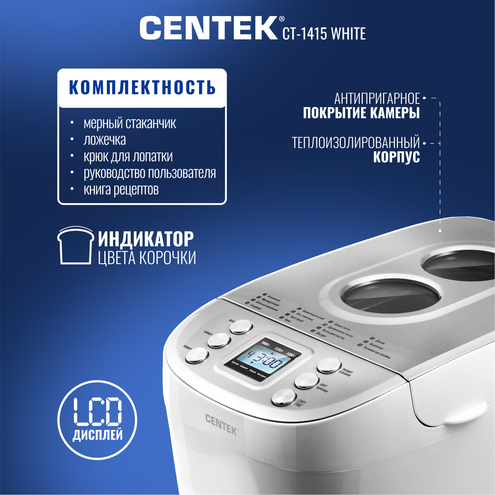 Хлебопечка Centek CT-1415 (бел/сталь) 1500 г большой объём, 860Вт, 15 программ, таймер, LCD, окошко белый цвет