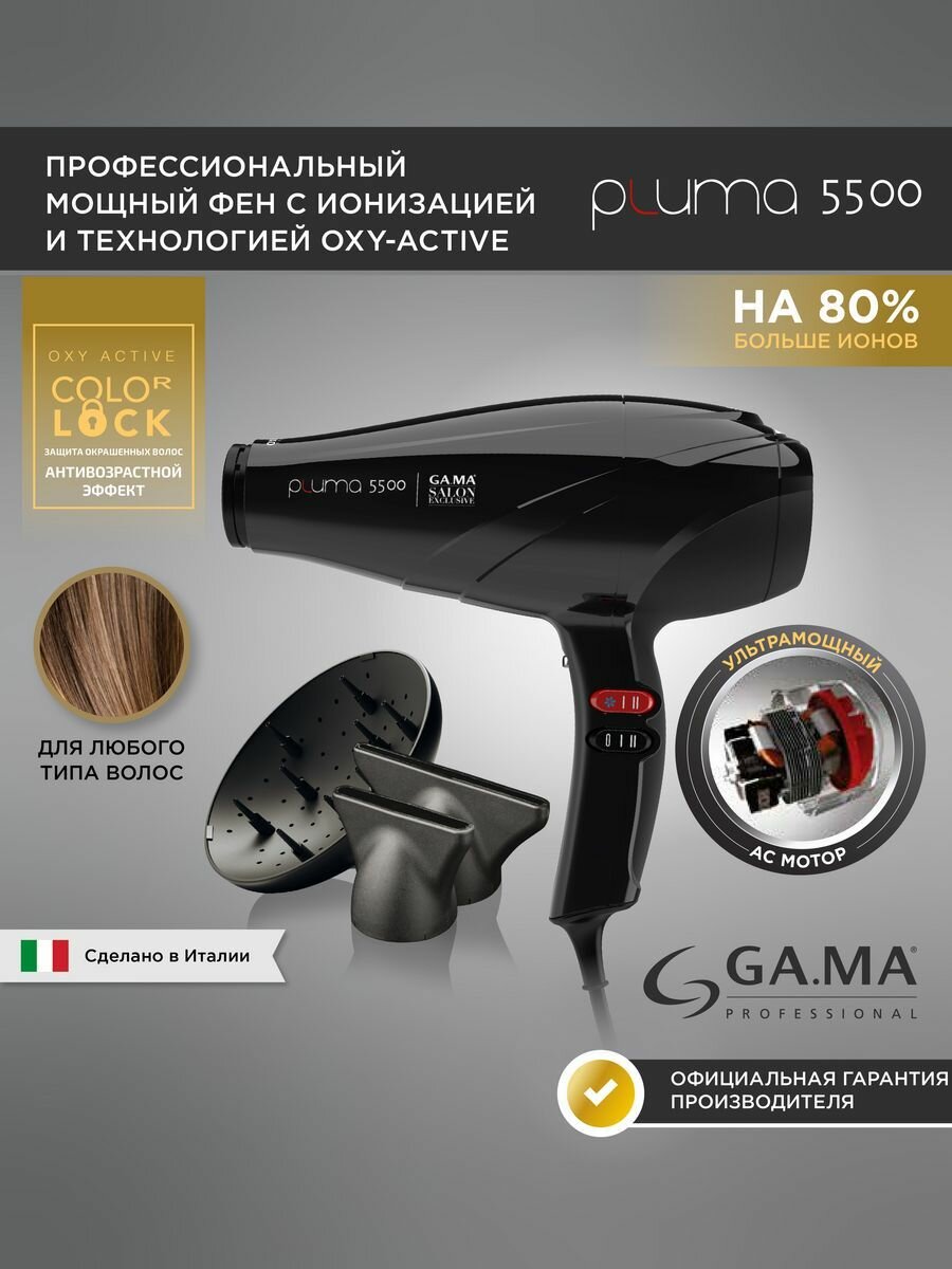 Ga-Ma PLUMA II 5500 OXY-ACTIVE Фен с ионизацией, W 2400 Вт, 2 сопла и диффузор в комплекте, чёрный