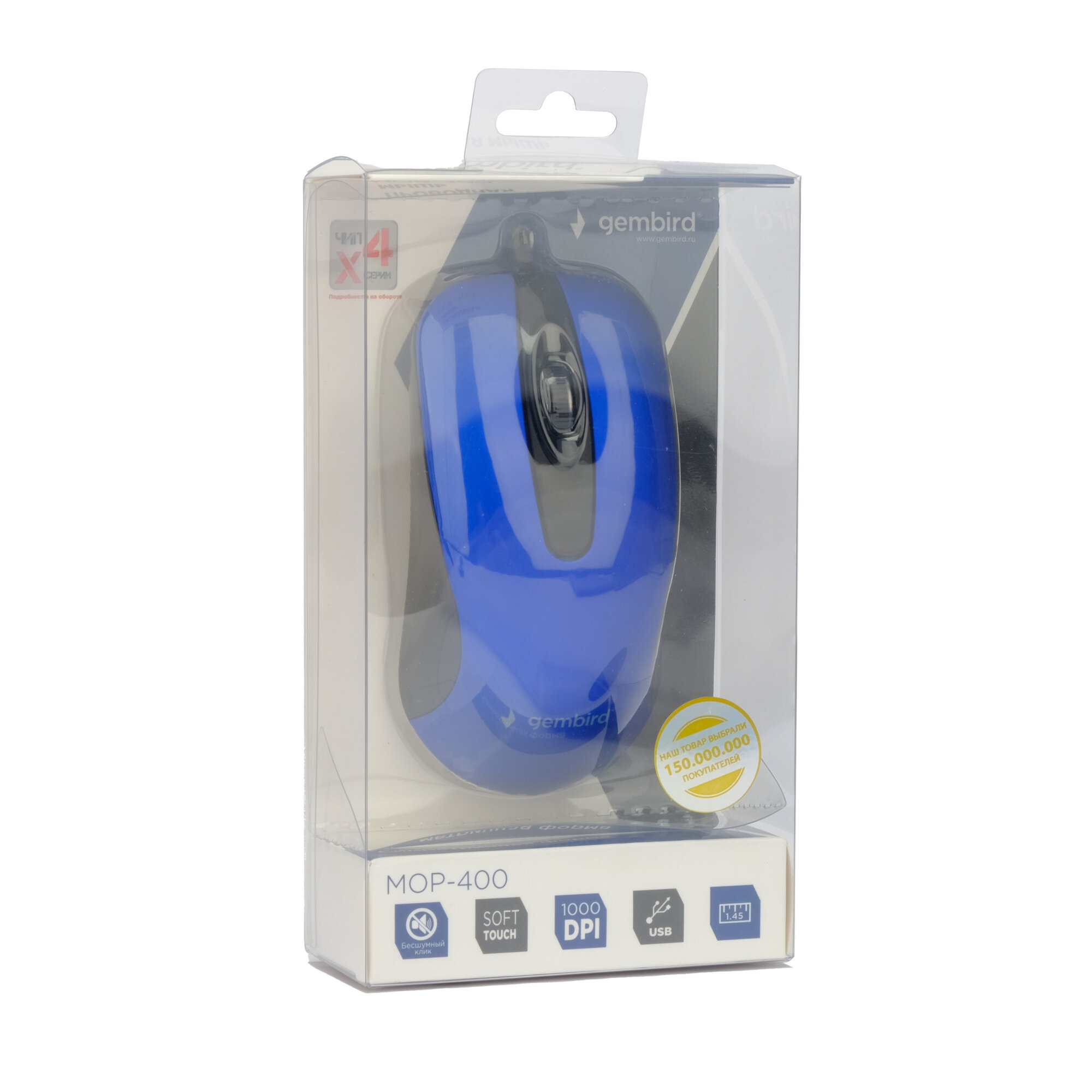 Мышь Gembird Mop-400-b, Usb, син, бесшум клик, 3кн, 1000DPI, soft-touch, каб 1.45м, блистер Gembird