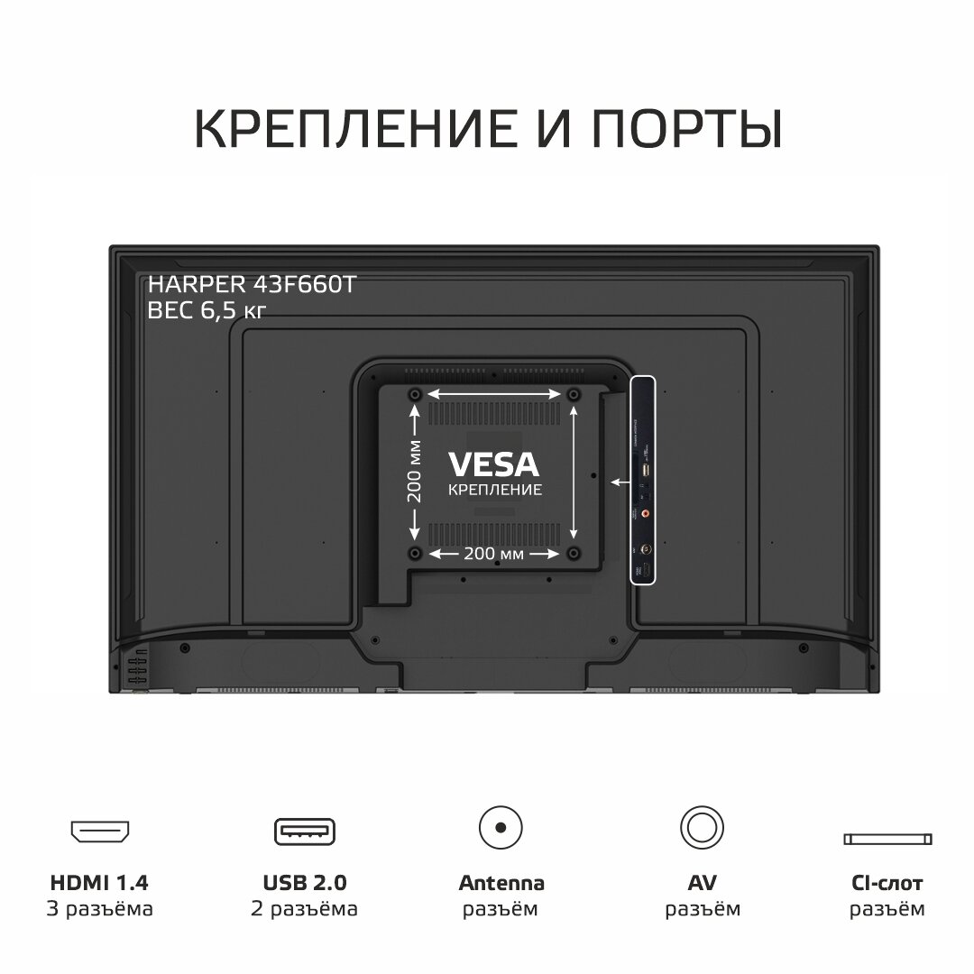 Harper телевизоры HARPER 43F660T FULL HD (1920 x 1080); Наличие цифрового тюнера: T2/S2; Габариты упаковки (ШГВ): 1 063x165x650; Объем, м3: 0,114; Вес, кг: 9,5 чёрный