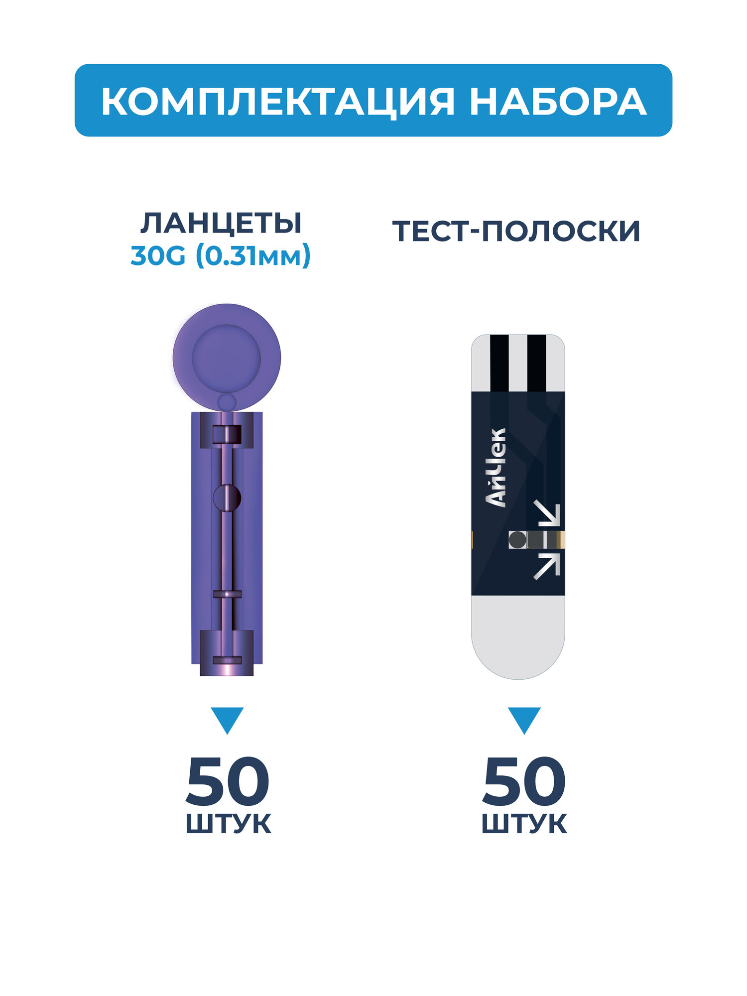 Набор iCheck/АйЧек: Тест-полоски 50шт+Ланцеты для контроля уровня глюкозы в крови 50шт