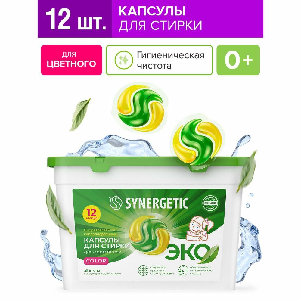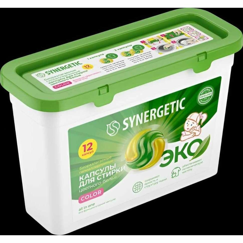 Капсулы для стирки Synergetic COLOR для цветного белья, биоразлагаемые, гипоаллергенные, 12 шт