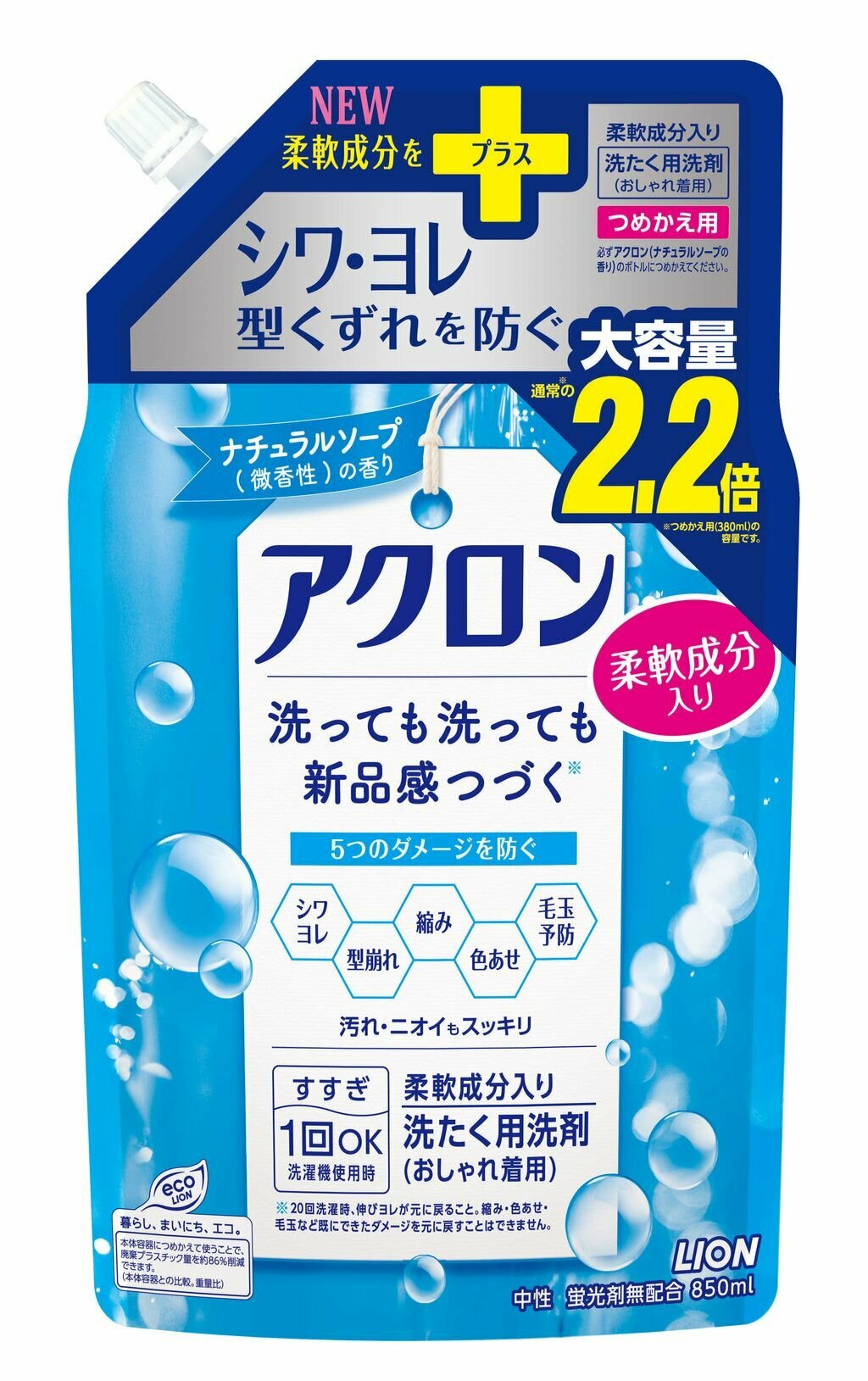 LION Жидкое средство для стирки "Akron" деликатных тканей с лёгким ароматом Нежное мыло 850 мл, мягкая упаковка с крышкой