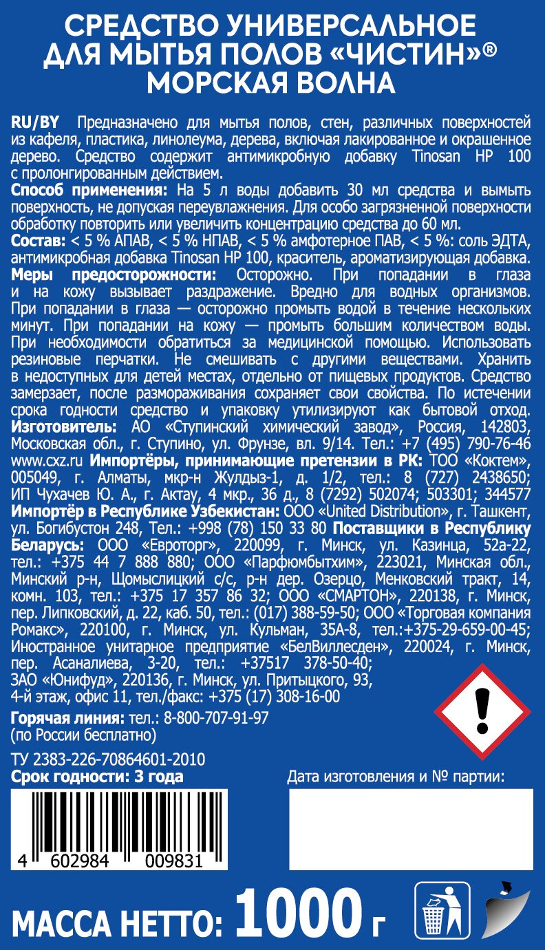 Моющее средство для пола Чистин 1000гр Морская волна, антимикроб. эффект арт.3183 (Ст.11)