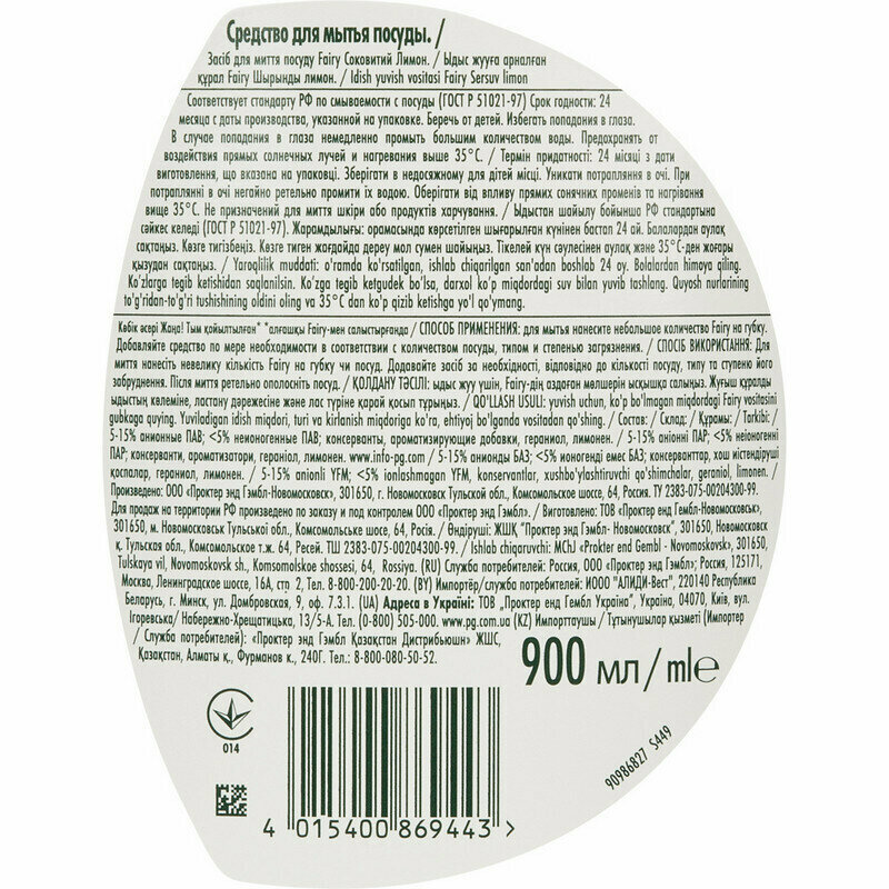 Средство для мытья посуды Fairy "Апельсин и лимонник", 900мл (4015400992097)