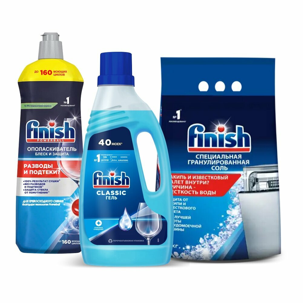 Набор финиш для посудомоечной машины Соль 1,5 кг. + Ополаскиватель 450 мл. + Гель 1 литр