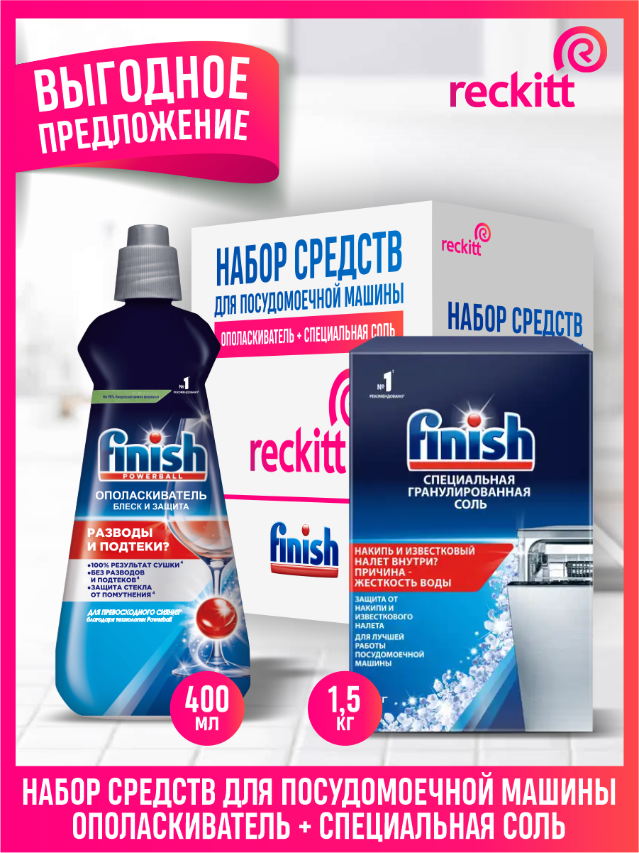 СохранитьНабор средств для ПММ FINISH Соль 1,5 кг. + Ополаскиватель Блеск и Сушка 400 мл. интересное: