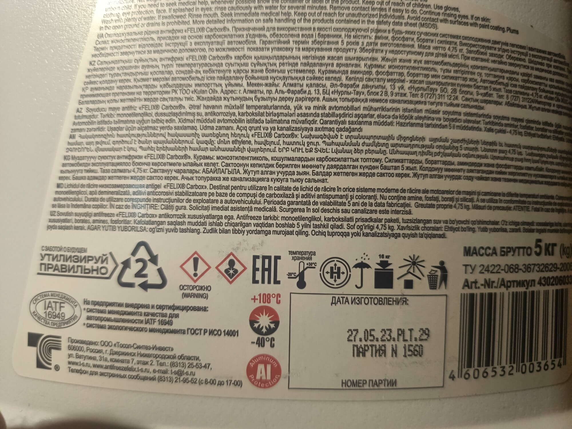 Ниже Вы можете прочитать отзывы на Антифриз Felix Tc-40 Carbox G12/40 5Кг Красный Felix арт. 430206033, ознакомится с подробными характеристиками, посмотреть интересные обзоры и фотографии на Антифриз Felix Tc-40 Carbox G12/40 5Кг Красный Felix арт. 430206033.