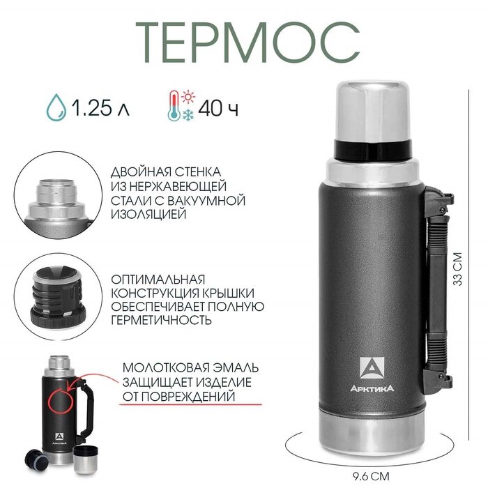 Термос Арктика 1,25 л, сохраняет тепло 40 ч, 33х9,6 см (6708968)
