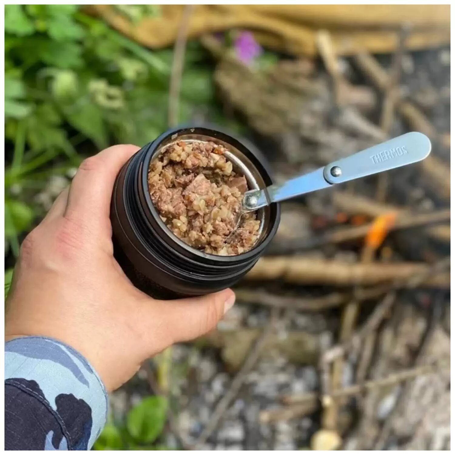Отличный термос фирмы Thermos ))) Для мужчин маловат. Тепло держит хорошо, надо перед закладкой еды налить кипятка - нагреть стенки 4-5 часов держит, после 6 часов еда все ещё тёплая. В комплекте есть ложка. Недостатки: Придираюсь, но фиксаторы ложки тугие можно сломать. Ну и цена, без скидки, дорого для маленького термоса. В целом покупкой доволен |