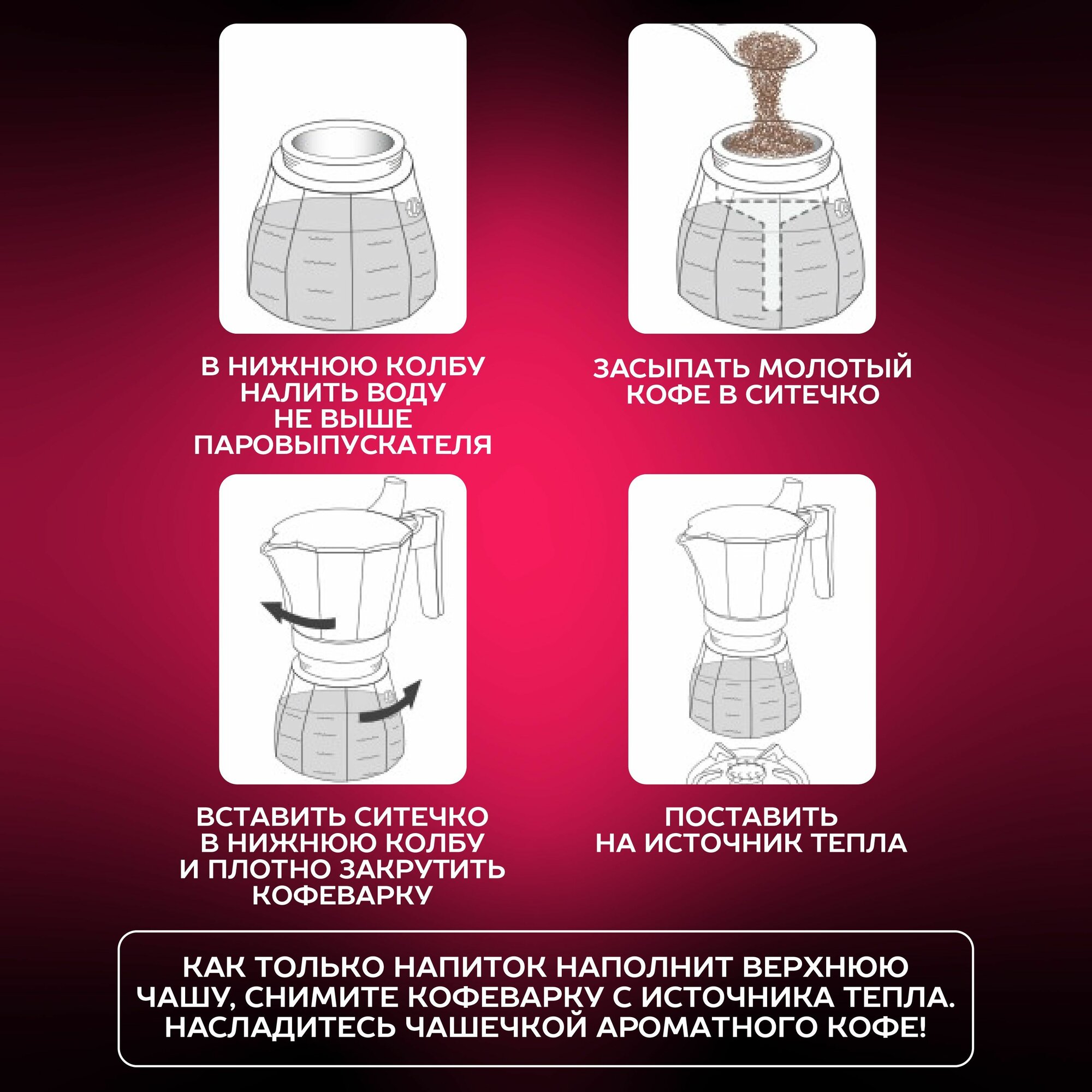 Кофе лучше использовать равномерного, "заводского помола", или использовать кофемолку с жерновами. Если кофе в чаше-сетке немного смочить водой перед приготовлением - вкус меняется, экспериментируйте! Если у вас индукционная плита - поищите кофеварку из нержавейки, или электрическую. |