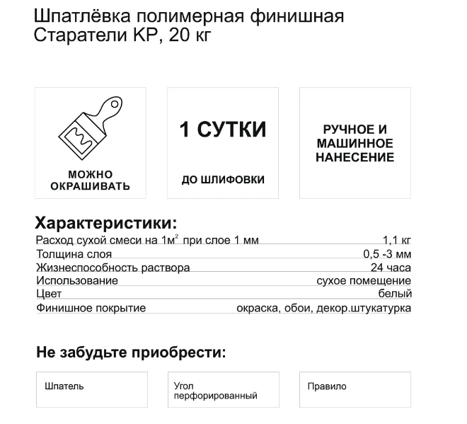 Ниже Вы можете прочитать отзывы на Шпаклевка Финишная КР Старатели Белая 20кг.*, ознакомится с подробными характеристиками, посмотреть интересные обзоры и фотографии на Шпаклевка Финишная КР Старатели Белая 20кг.*.