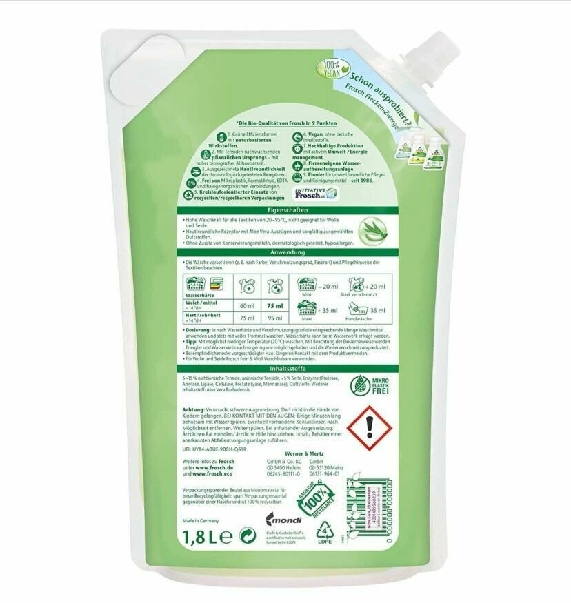 Жидкость для стирки Frosch Алоэ Вера, 1.8 л, пакет 24 стирки