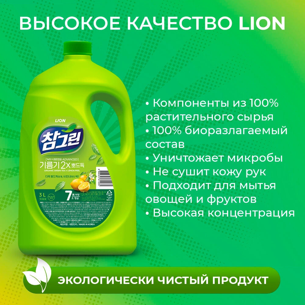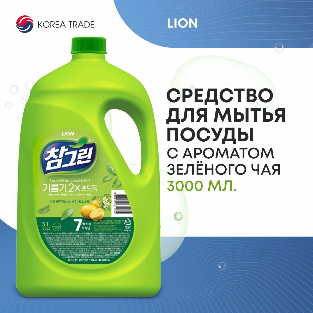 Lion Средство для мытья посуды, овощей и фруктов Chamgreen Green Tea & Lemon Peel, 3л