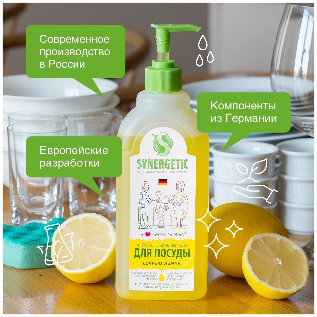 Средство для мытья посуды Synergetic "Лимон", с антибактериальным эффектом, 500 мл