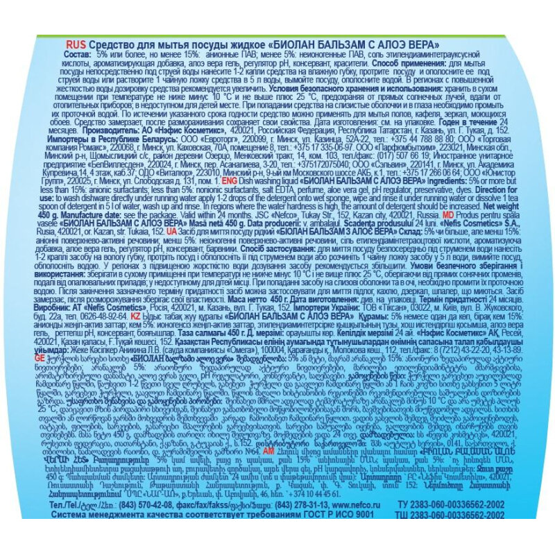 Средство для мытья посуды 450 мл, БИОЛАН "Бальзам Алоэ Вера", 1126-3, 2 штуки
