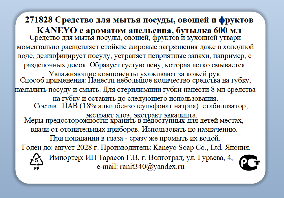 Жидкость для мытья посуды овощей и фруктов Kaneyo, Сладкий апельсин, 600 мл