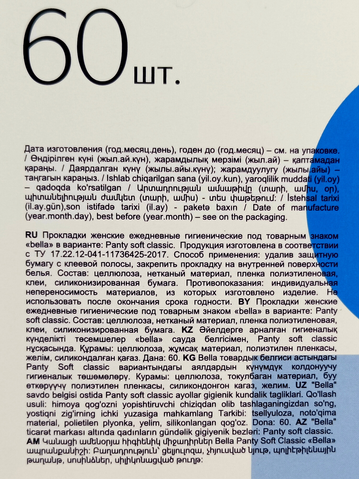 Прокладки BELLA "Panty Classic", Soft, голубая упаковка, 60 шт