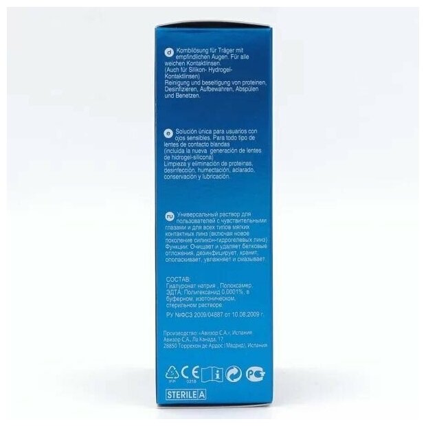 | Отзыв: | Решил попробовать после "обычного" Avizor, который чуть дешевле (этого не было в местной оптике). Если обычный уже был значительно лучше, нежели повсеместный Опти-Фри, то этот вообще шик. Однозначно стоит своих денег (заказывал по 520 руб за бутылку). |