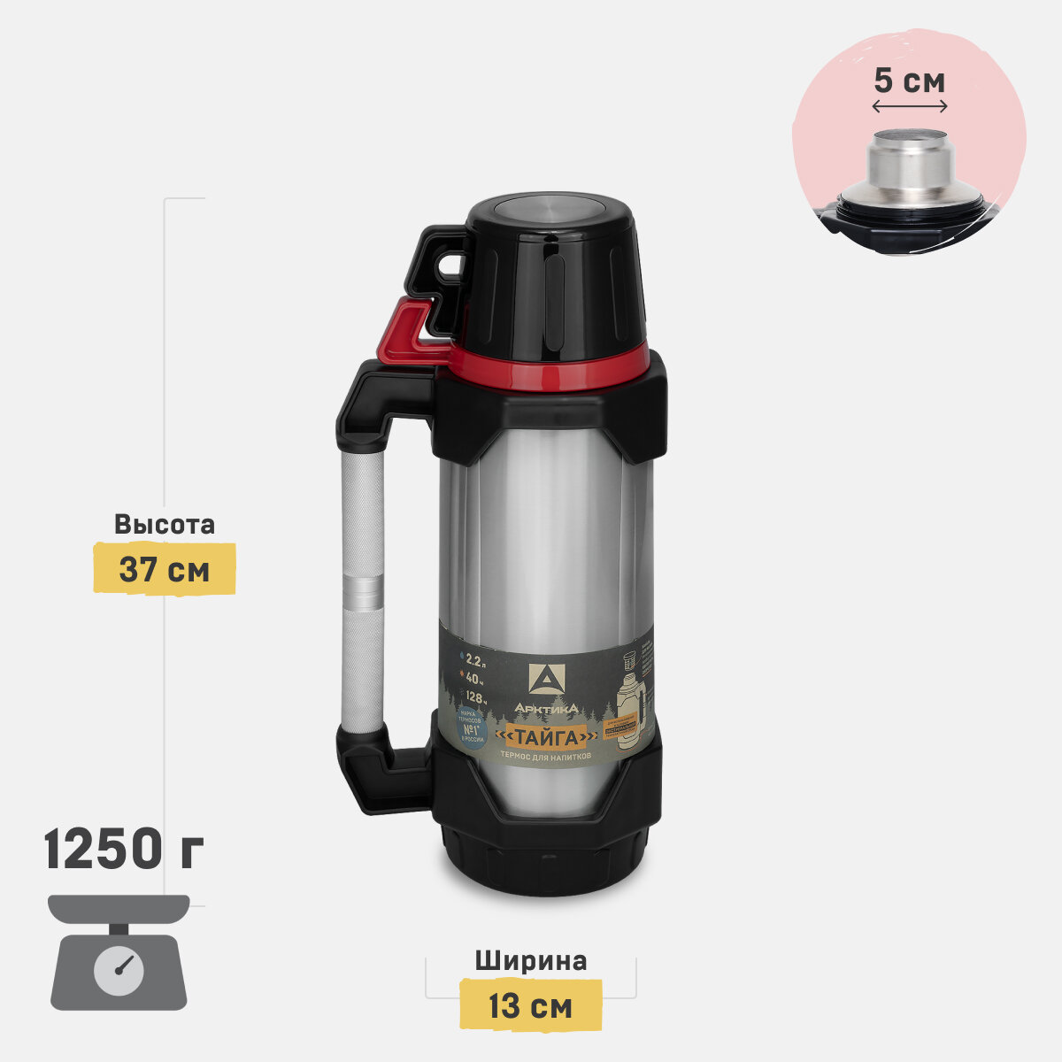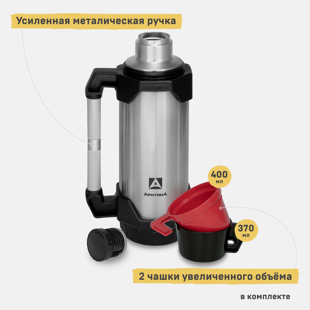 Термос с двумя чашками 2,2 л Арктика Тайга 110-2200 усиленный корпус с ручкой для похода и рыбалки
