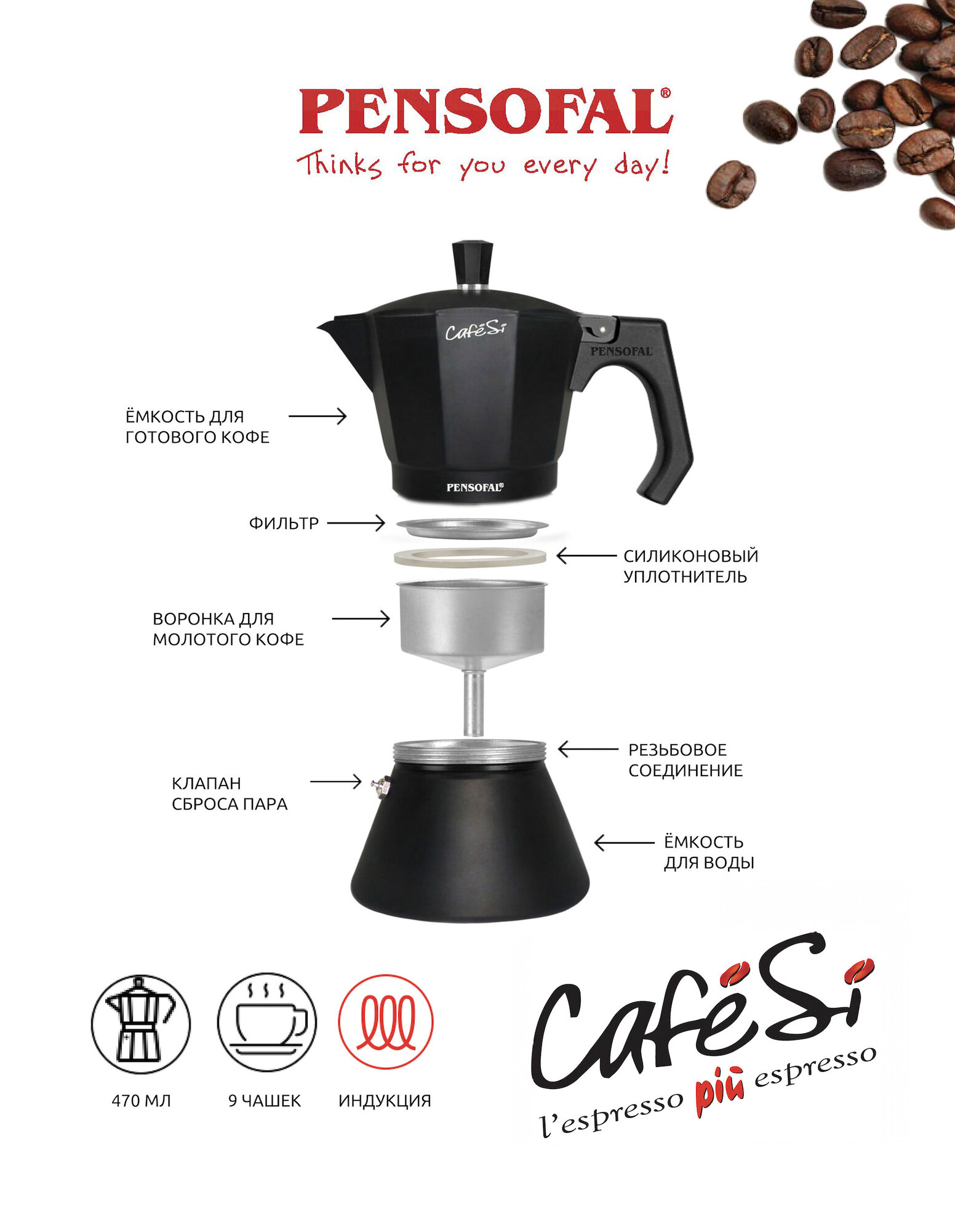 Кофеварка гейзерная 9 чашек PENSOFAL PEN 8409 CafeSi, 470 мл, подходит для индукционной плиты интересное: