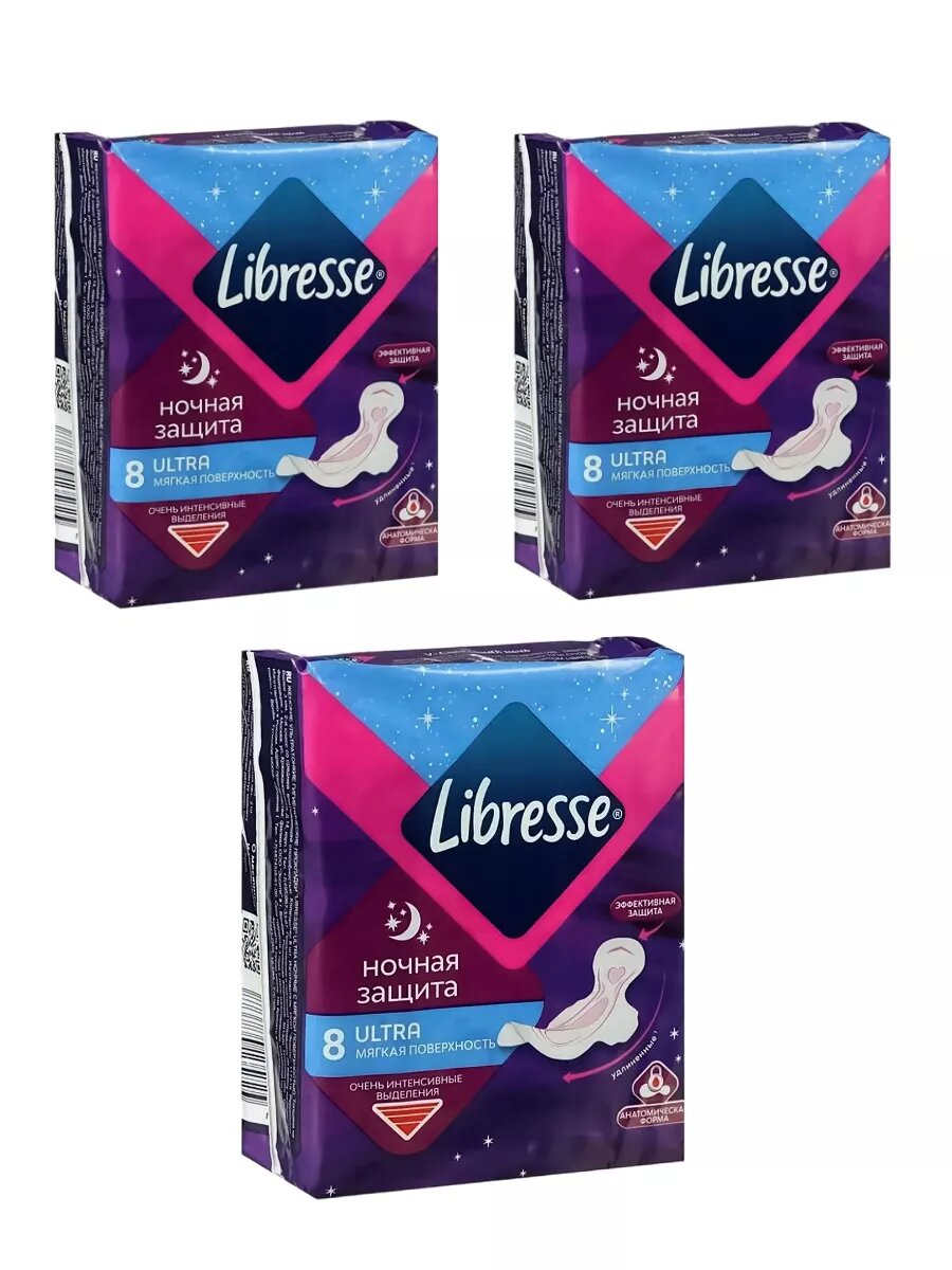 Либресс / Libresse Набор 3шт Прокладки женские Гигиенические Ultra Night 8 шт
