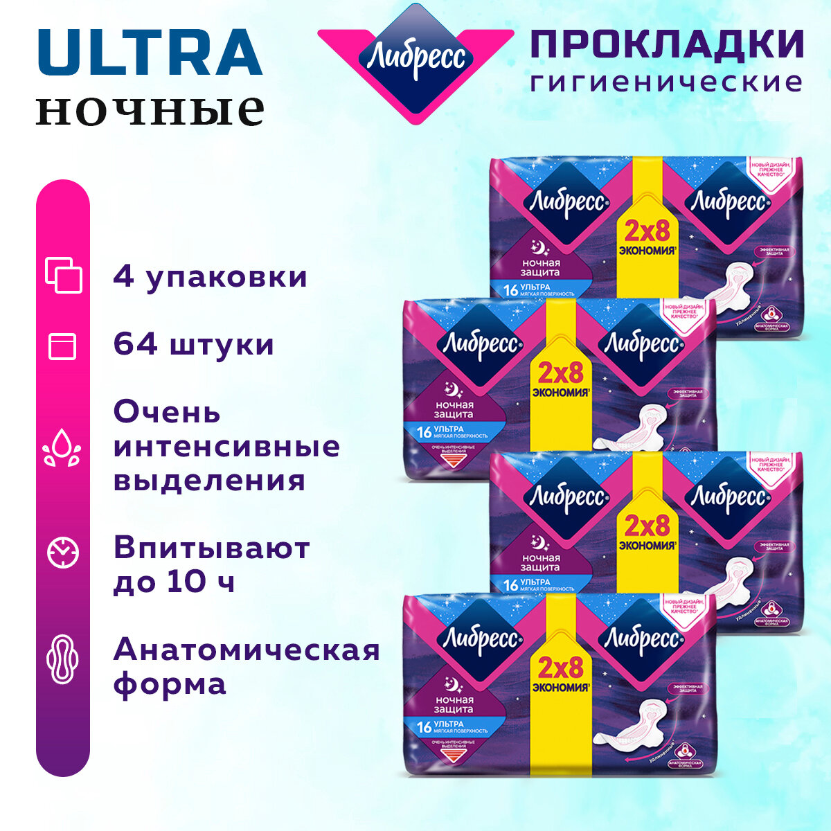 Купить Прокладки женские Либресс Ultra Ночные 64 шт. 4 упак.