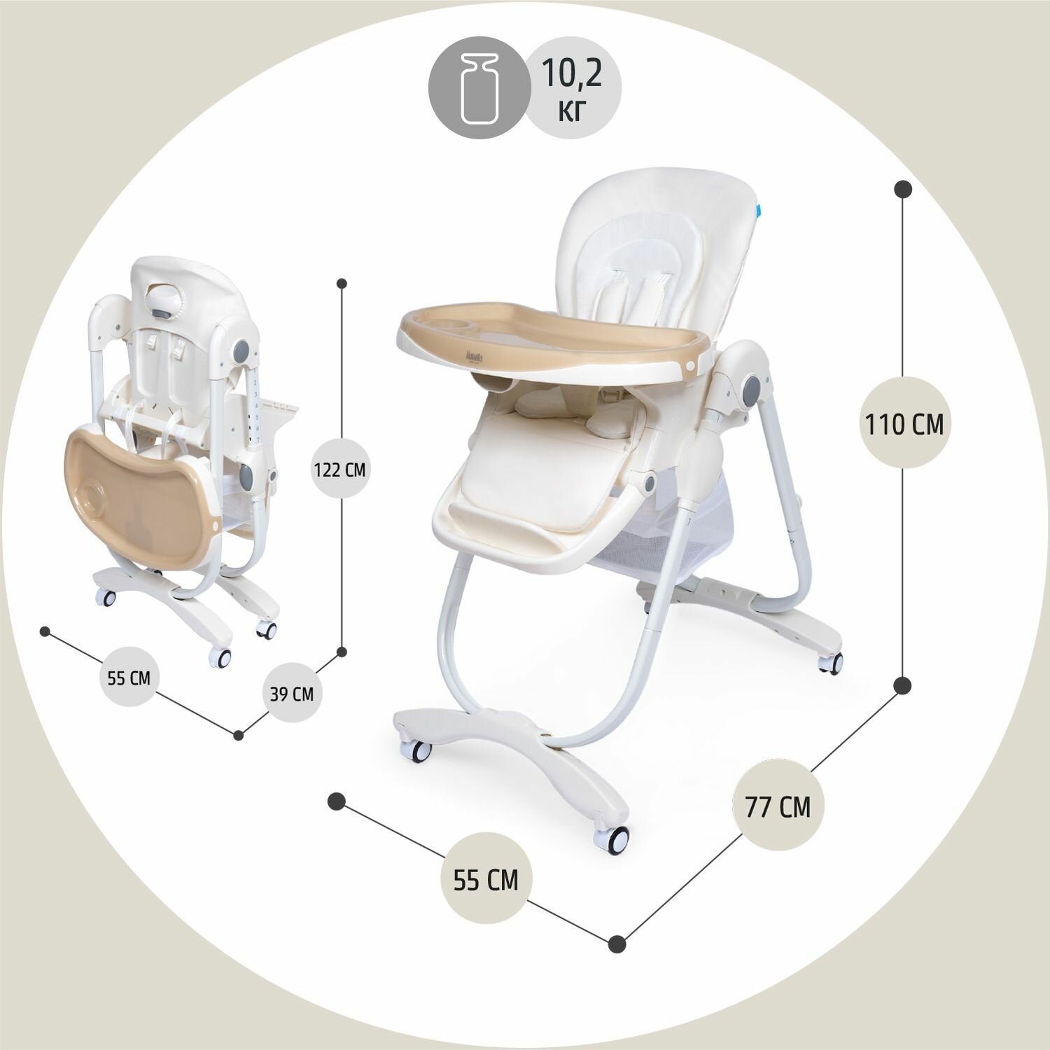 Столик снимается, поэтому иногда просто пристёгиваю малыша ремнями и сажу возле себя, когда чем то занята. Стульчик складывается и легко влазит в багажник машины.