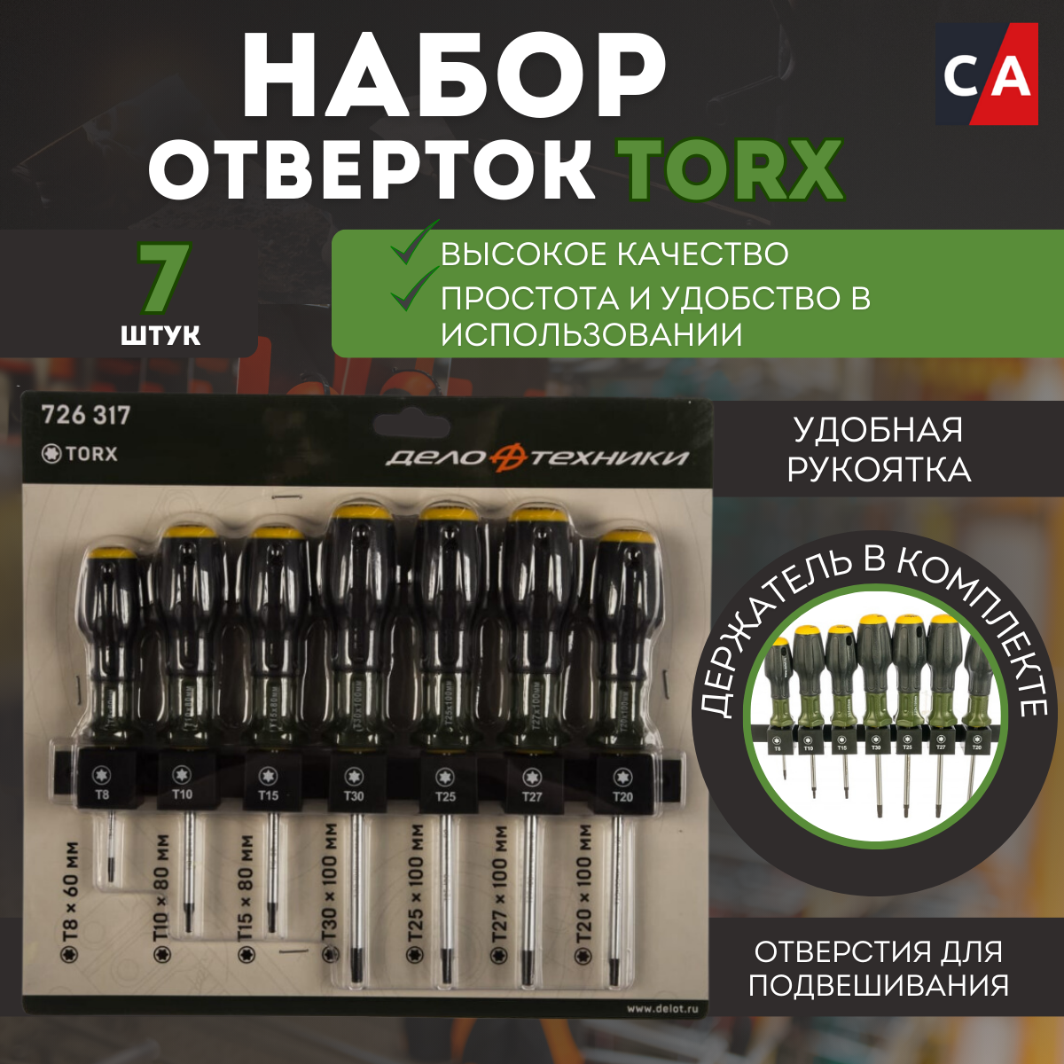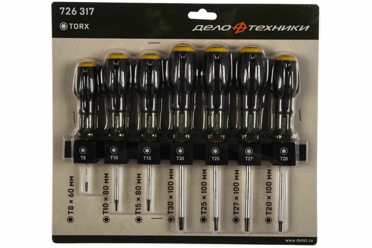 Дело техники 726317 Набор отверток TORX без отверстия 7 пр (Т8х60, Т10х80, Т15х80, Т20х100,Т25х100,Т27х100, Т30х100мм) 16/4
