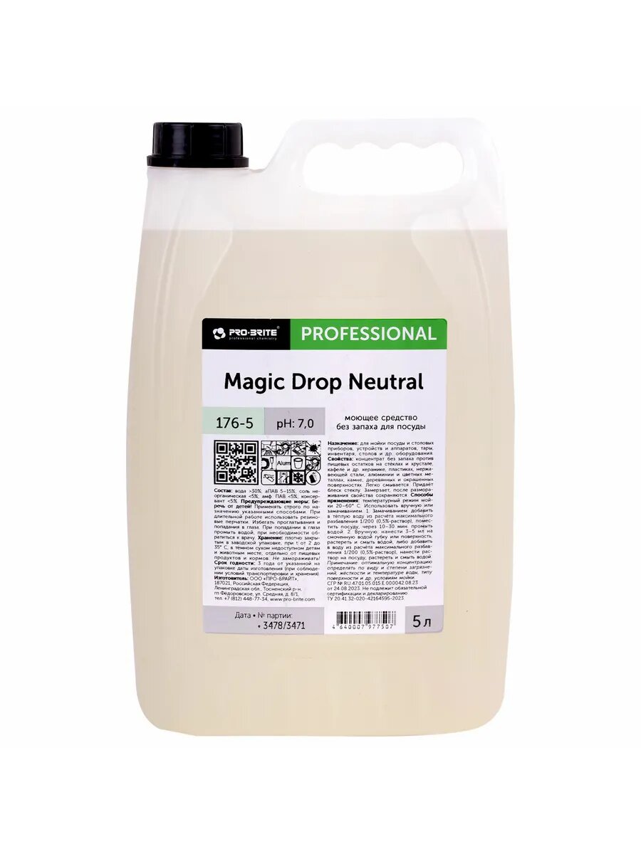Средство для мытья посуды 5л PRO-BRITE MAGIC DROP Neutral, без запаха, нейтральное, концентрат, 176-5