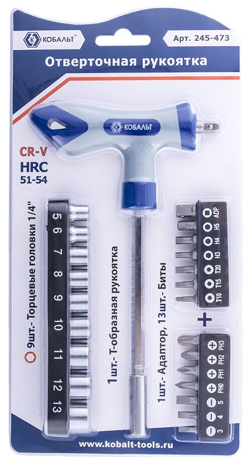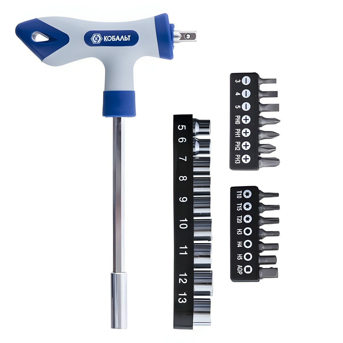 Купить Отвертка рукоятка кобальт Т-образная с набором бит и торцевых головок 1/4", CR-V (24 шт.) (245-473)