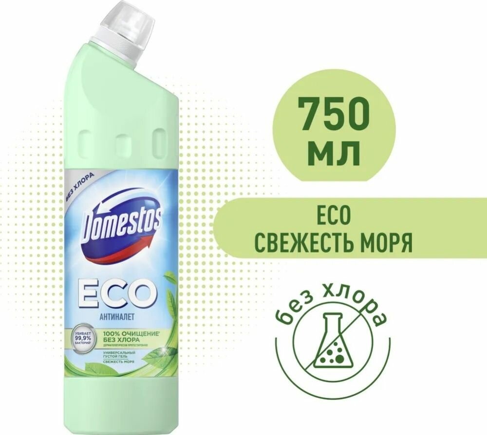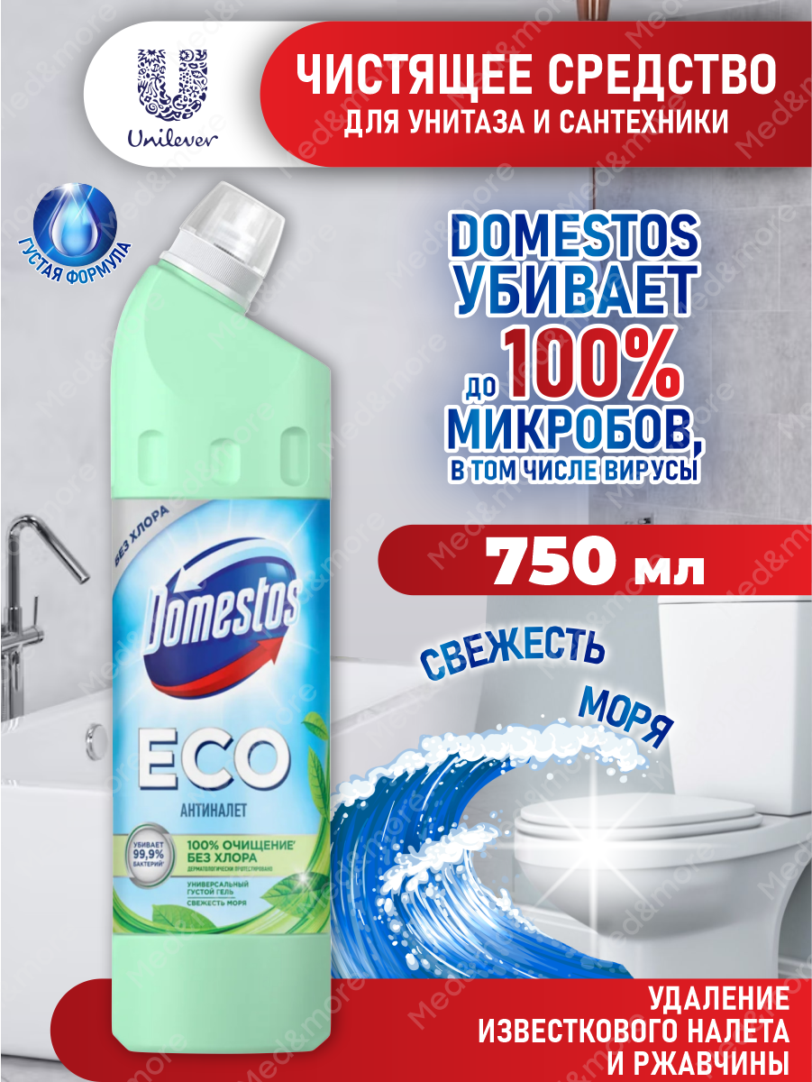 Domestos ЕСО Антиналет, универсальное чистящее эко средство для туалета и ванной, Свежесть Моря, без хлора, 750 мл