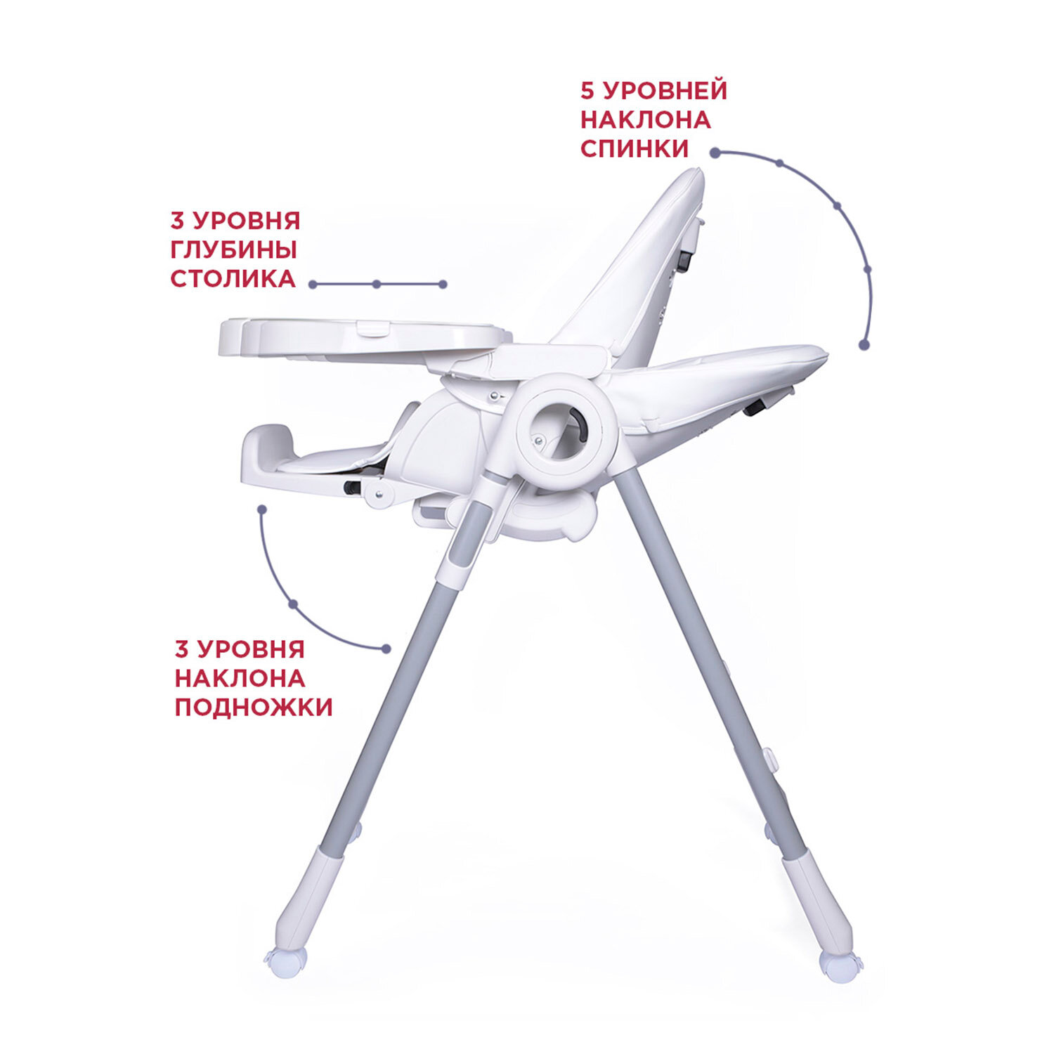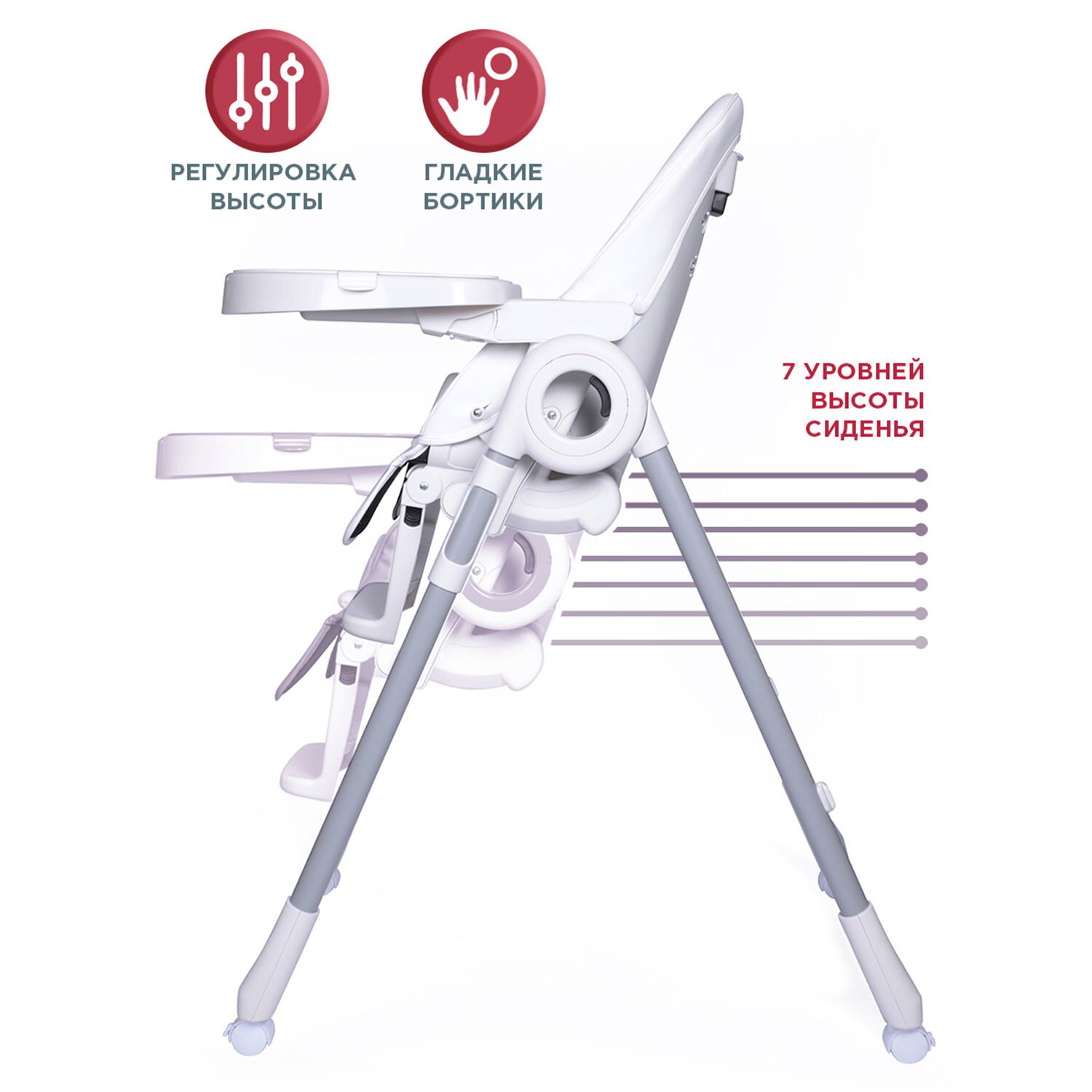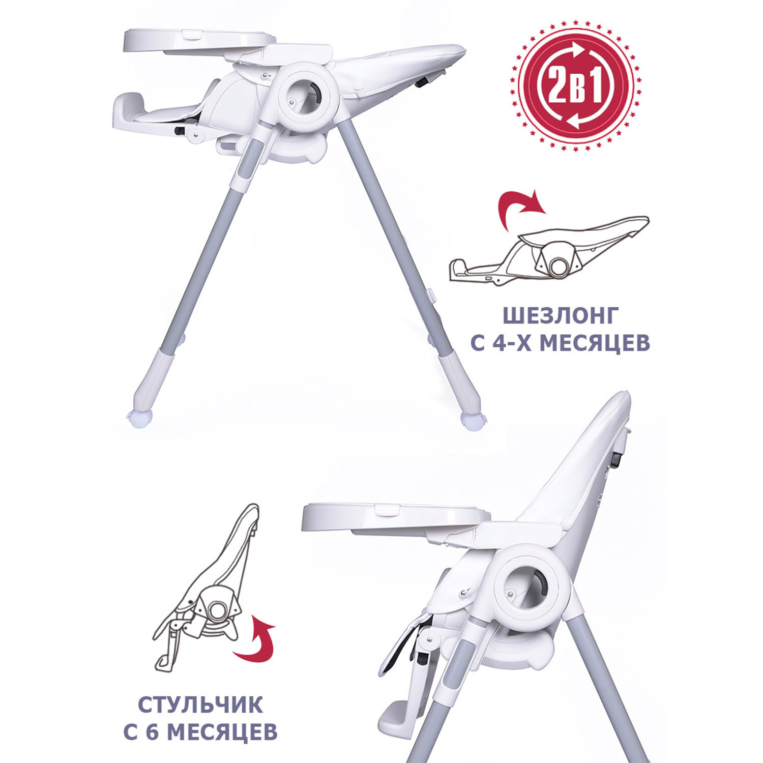 Сиденье стульчика можно закрепить на разной высоте. Спинка регулируется до полулежащего положения. Съёмный столик, что очень удобно для первого прикорма. Покупкой очень довольны.