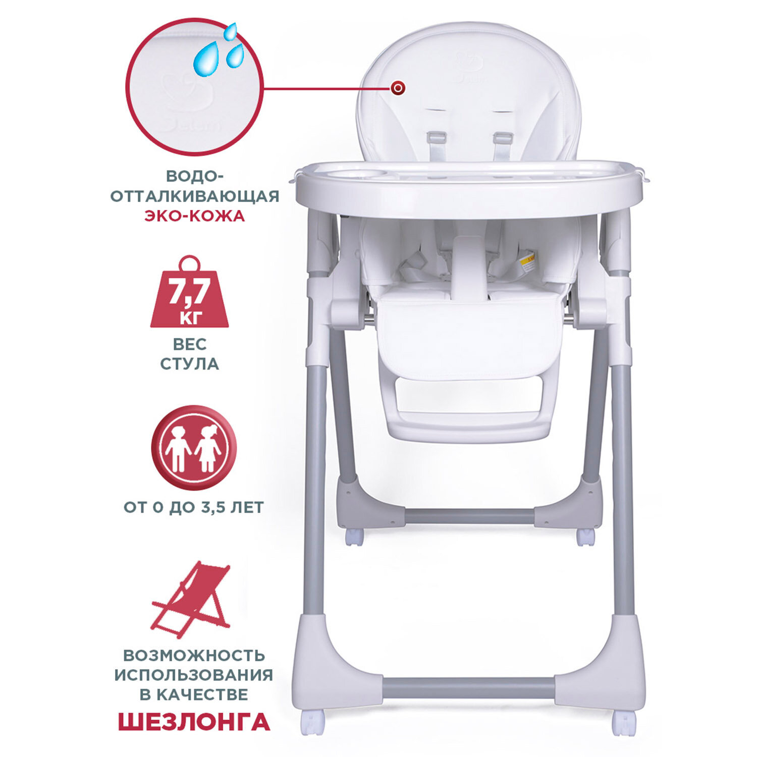 Прекрасный стульчик! Регулируется легко и в разных вариациях. Само сиденье сделано из экокожи. Сидеть мягко и протирать удобно. Дизайн лаконичный. Отлично подходит для нашей новой кухни. Здорово, что цвет однотонный, а не аляпистый. Есть ремни безопасности и разделитель для ножек. Так что даже самый резвый малыш вряд ли оттуда выберется).