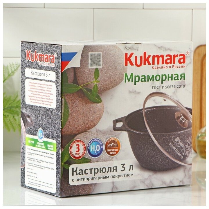 Кастрюля Kukmara "Мраморная" 3л с антипригарным покрытием (темный мрамор) со стеклянной крышкой