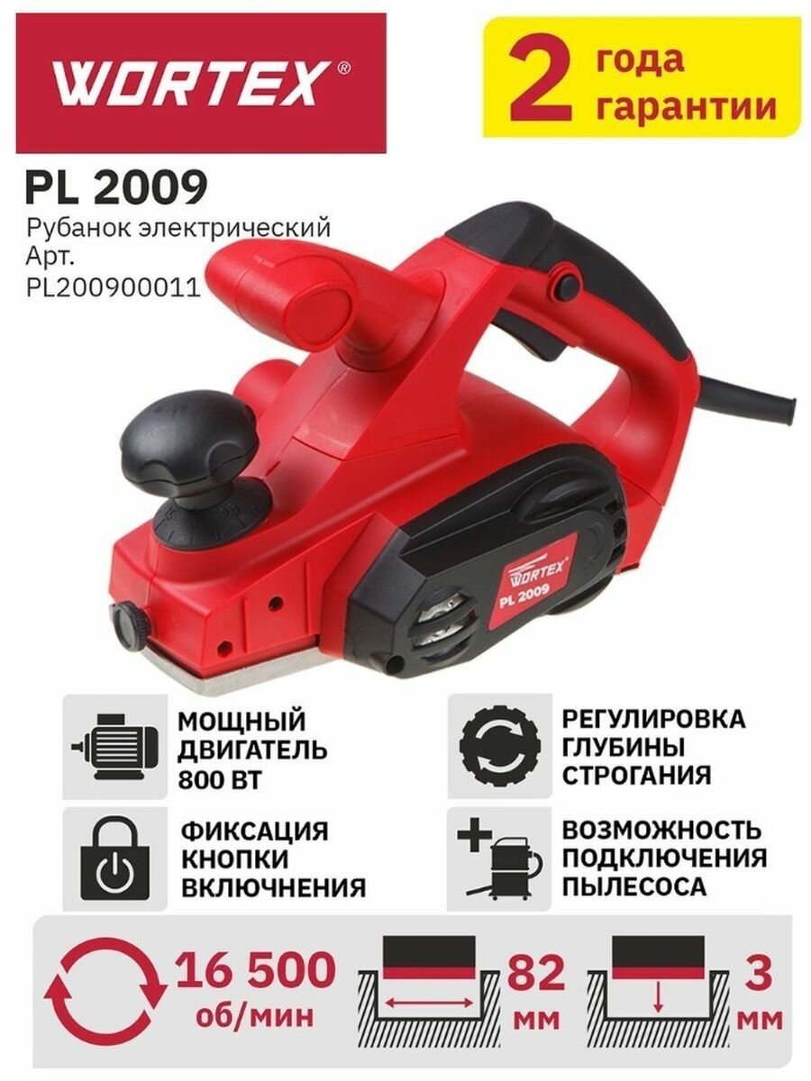 Рубанок электрический Wortex PL 2009, в коробке, 800 Вт, ширина до 82 мм, глубина до 3.0 мм, (PL200900011)
