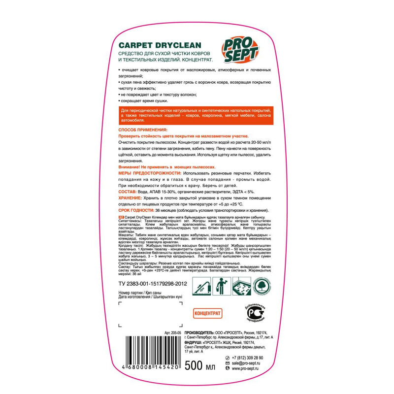 Средство для ковров Prosept Carpet DryClean шампунь д/сухой чистк конц 0,5л 1462354 205-05