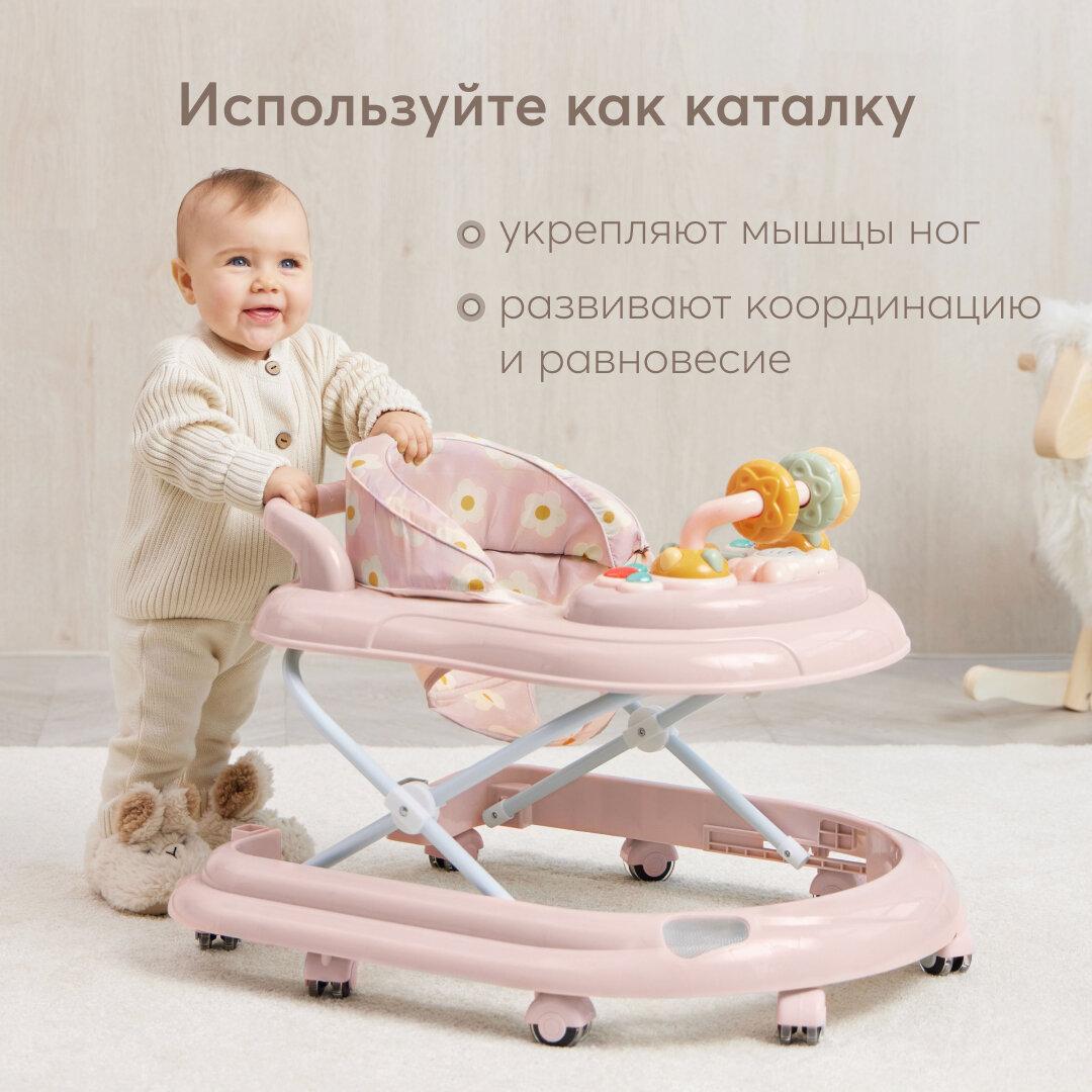 Ходунки детские Happy Baby SMILEY V2, ходунки каталка для детей с игровой музыкальной панелью, 12 мелодий, регулировка сиденья на 3 положения, силиконовые колесики, розовые