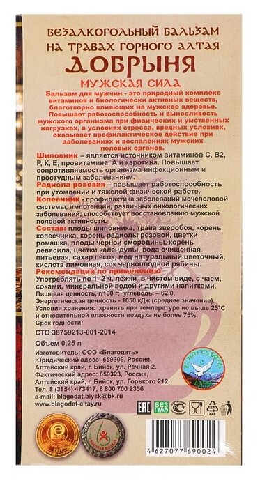 Бальзам безалкогольный "Добрыня" мужская сила, 250 мл Благодать с Алтая 3876353 .