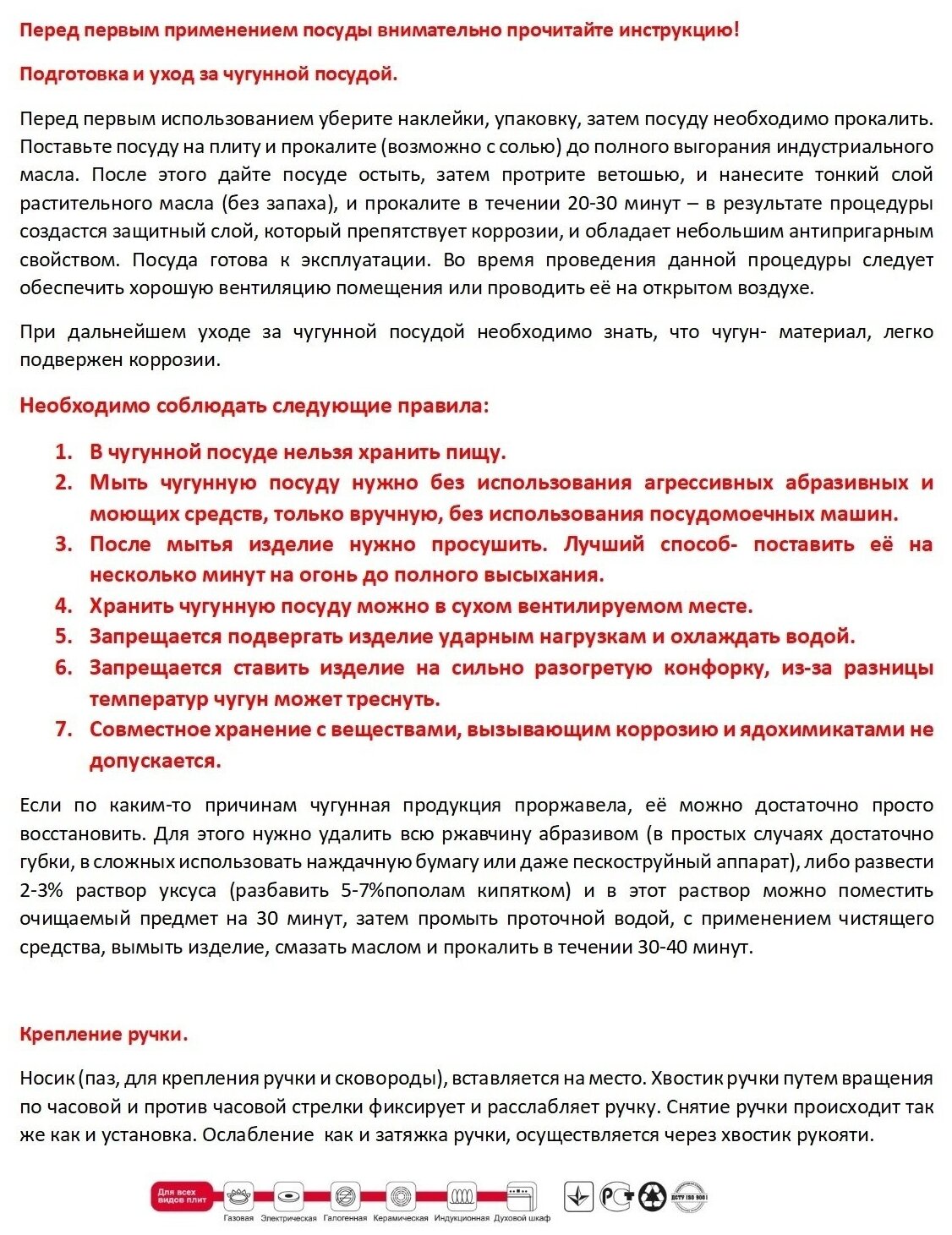 | Минусы: | При неправильном обращении с чугуном возможно появление коррозии (устраняется чисткой наждачной бумагой и последующей порокалкой с нанесением масла). Тяжёлая. |