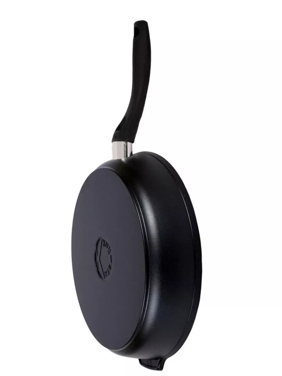 | Плюсы: | Первое впечатление - добротная сковорода, своим весом и толщиной вызывает доверие. Ручка без люфтов, удобная. Высокие борта. |