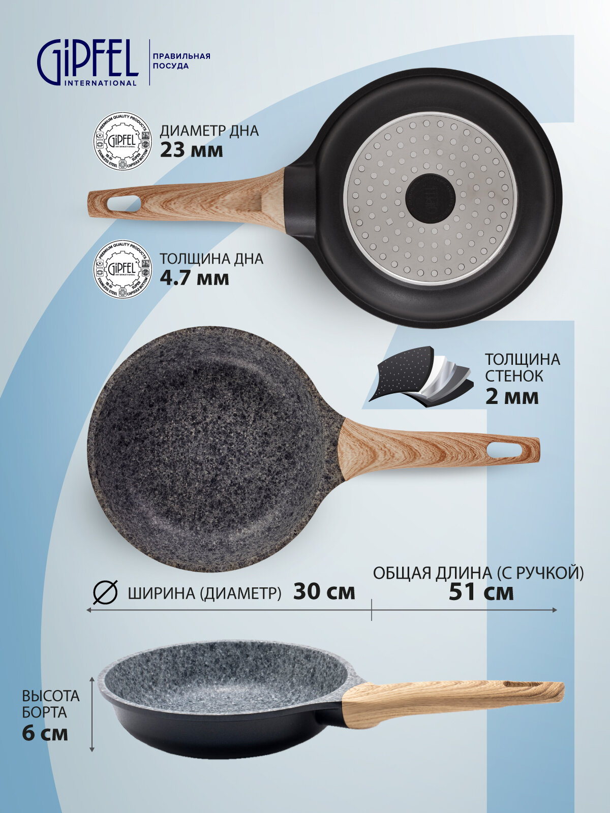 Сковорода алюминий, 30 см, антипригарное покрытие, Gipfel, Pfluon Granite, 0569, бакелитовая ручка, Oliver, индукция