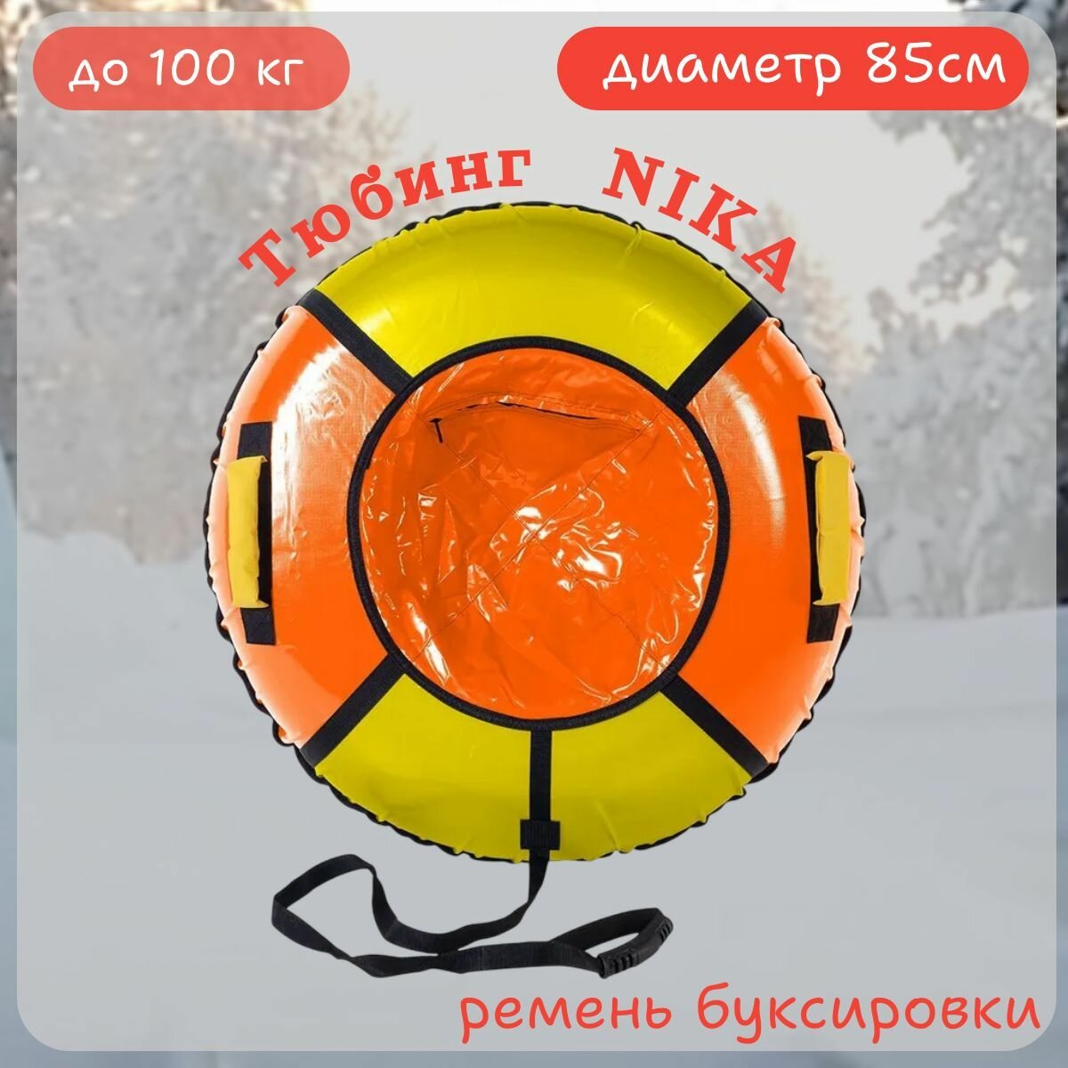 Санки-ватрушка Nika, 85 см, 90 кг, с буксировочным тросом, с ручками, камера в комплекте, оранжевый, желтые, ТБ1К-85