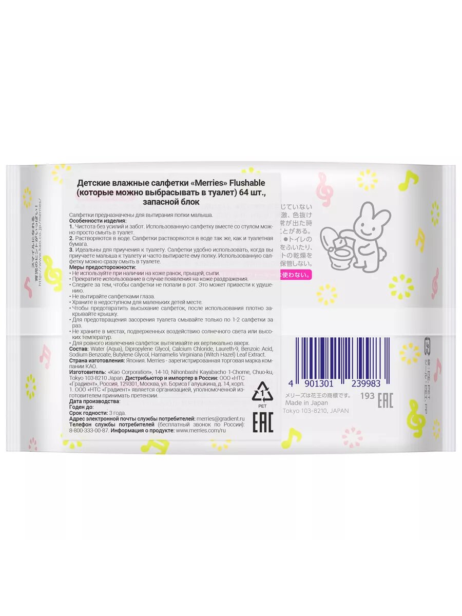 MERRIES Детские влажные салфетки Flushable , Запасной блок. 64 шт.