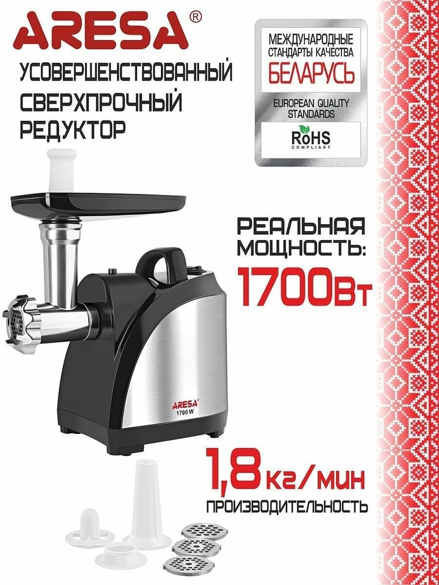 Мясорубка Aresa AR-2103, 1700 Вт, Производительность: 1,8 кг/мин, Реверс, Система крепления "EasyFix", защита двигателя от перегрузки, Ручка для переноски, Нескользящие ножки, сверхпрочный редуктор
